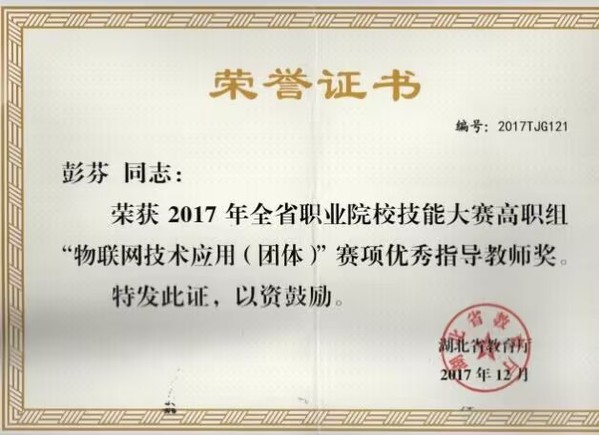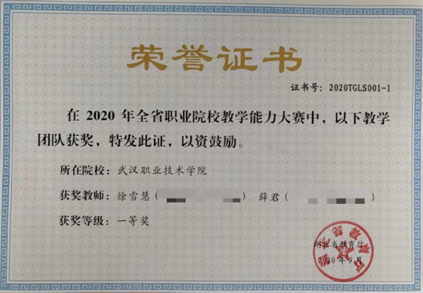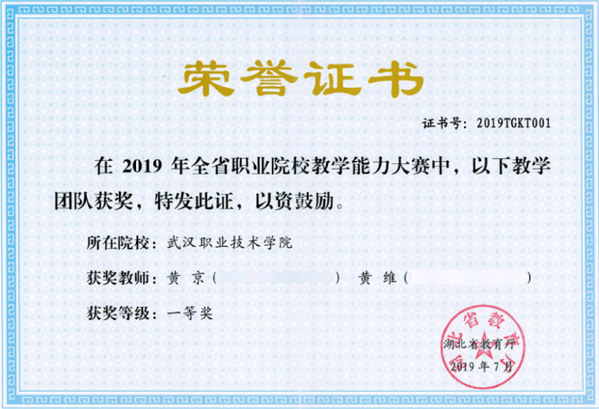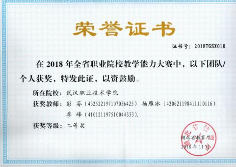 教师团队道德高尚、基础扎实、经验丰富、教学能力强、学术水平高:在全国职业院校教学能力比赛获国家级一等奖1项、国家级三等奖1项;在湖北省职业院校教学能力比赛中,获省级一等奖2项、省级二等奖1项;辅导员工参加职业院校技能竞赛,教师获得了优秀指导教师、优秀教练、优秀教师等荣誉称号、担当过全国职业院校技能大赛裁判员;主持建设的课程获得职业教育国家在线精品课程1项,省级在线精品课程1项,一流核心课程1项。